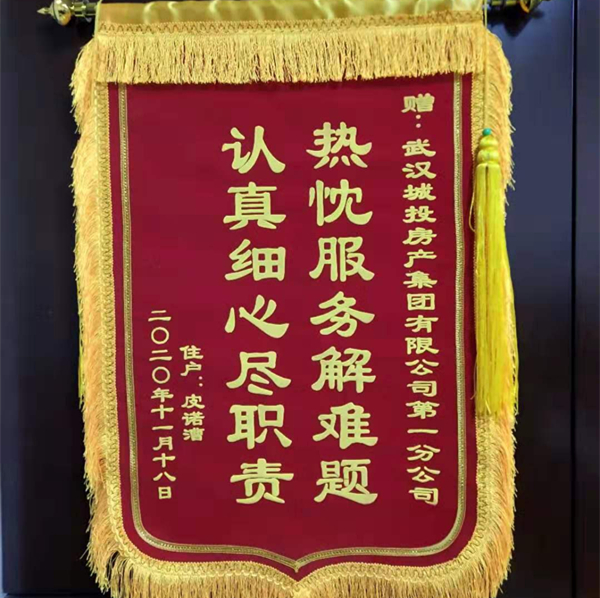11月21日,江汉路14号住户周女士将一面锦旗送到一分公司工程维修人员手中,并连连致谢,感谢一分公司对家中屋顶的彻底维修,解决了她的烦心事。